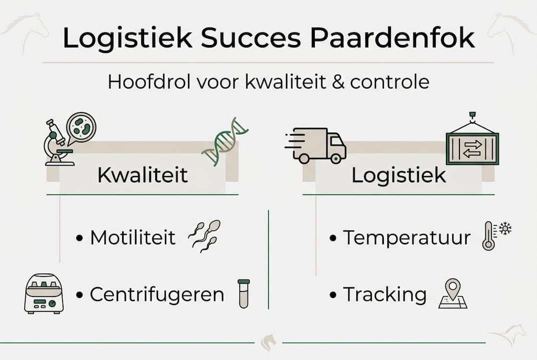 De kwaliteit van logistiek bepaalt het verschil tussen succesvolle fokresultaten en teleurstellende zwangerschapspercentages. Veel hengstenhouders onderschatten hoe kritisch transportdetails zijn voor het behoud van spermakwaliteit en embryokwaliteit tijdens verzending. Een kleine fout in temperatuurbeheer, verpakking of timing kan leiden tot aanzienlijk kwaliteitsverlies en gemiste fokkansen. Dit artikel behandelt de essentiële aspecten van kwaliteitsbewaking in logistiek voor paardenreproductiemateriaal, van regelgeving en verwerkingsmethoden tot praktische transportoplossingen en succespercentages die hengstenhouders en fokkers nodig hebben om hun fokprogramma's te optimaliseren.