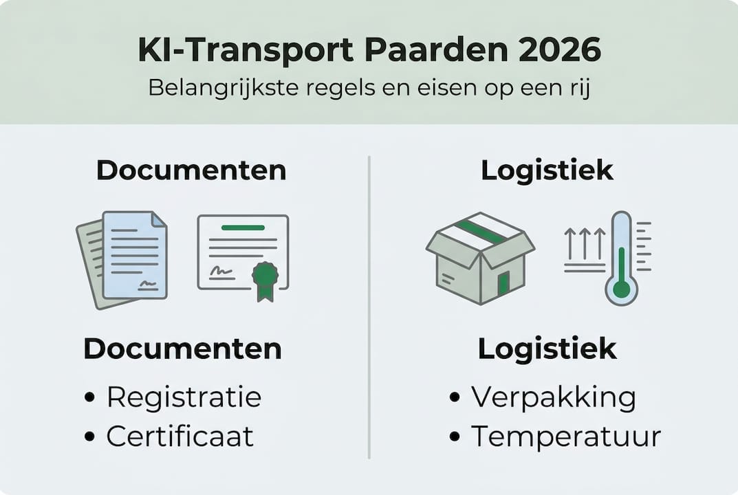 Veel hengstenhouders en fokkers denken dat ze de regels voor transport van KI-materiaal wel kennen, totdat een zending wordt tegengehouden aan de grens of een boete binnenkomt. De regelgeving rondom paardensperma, embryo's en ander reproductiemateriaal is strenger dan veel mensen verwachten en verandert regelmatig. Een verkeerde verpakking, een ontbrekend certificaat of een verlopen registratie zijn genoeg om een levering te laten mislukken. Dit artikel geeft u een helder en actueel overzicht van de wettelijke kaders, de praktische stappen en de meest voorkomende valkuilen, zodat u uw transport van KI-materiaal zonder problemen kunt regelen.